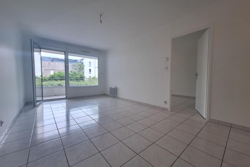 A LOUER - NANTES Cité des congrès - Appartement 2 pièces 42.85m² - Au cœur de ce quartier recherché, à deux pas de l'hyper centre, des transports, commerces et de la gare, bel appartement au calme côté cour de 2 pièces de 42.85 m². Situé au 1er étage de cette résidence de 2007, ce logement est composé d'un séjour avec cuisine aménagée et équipée (plaques de cuisson et hotte) le tout donnant sur un balcon avec vue sur espaces verts, d'un cellier et d'une chambre avec salle d'eau attenante. Place de parking en sous-sol sécurisé. Chauffage et eau chaude individuels électriques.