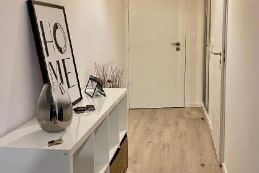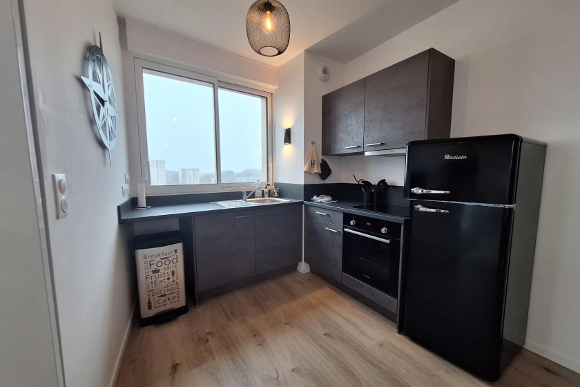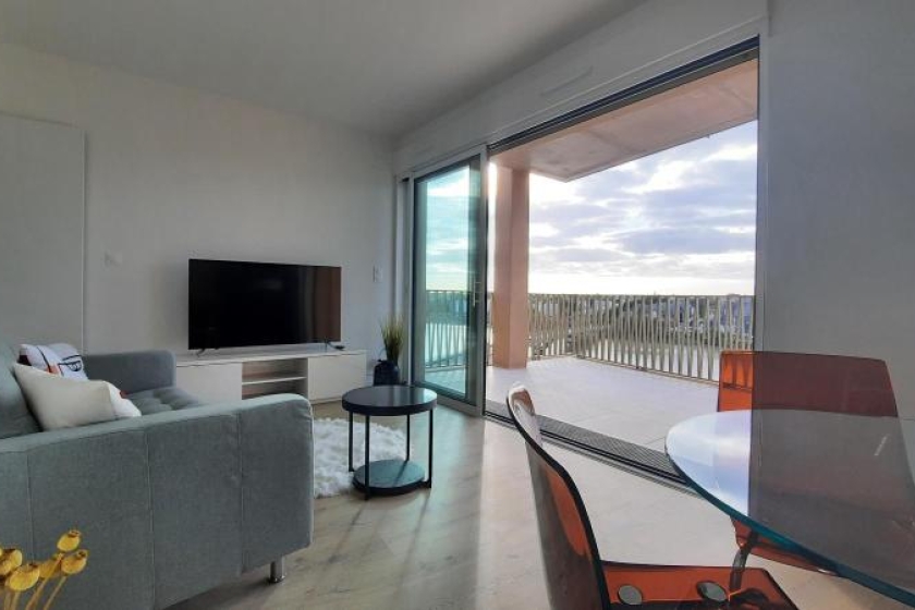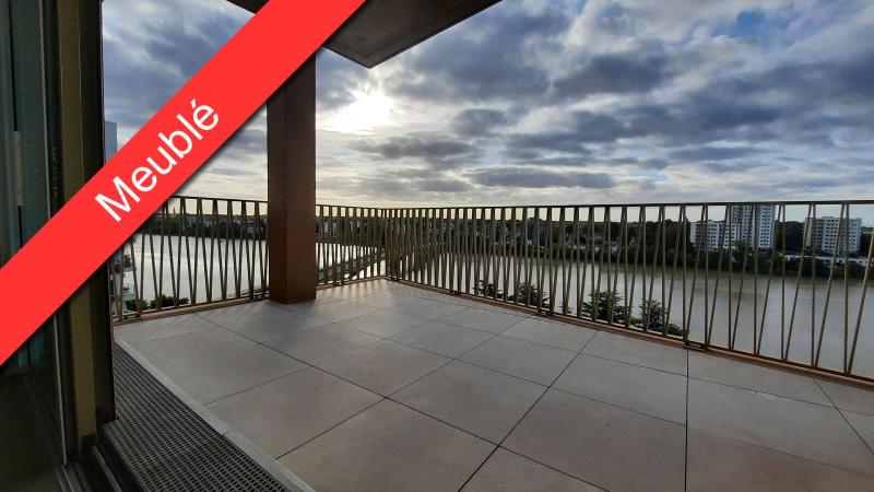 A LOUER - Appartement T2 Meublé - NANTES Vue LOIRE - Appartement T2 MEUBLE de 45.44m2 sur les bords de la Loire, à proximité du centre commercial BEAULIEU et des transports, dans une résidence de 2023 situé au 8ème étage avec ascenseur. L'appartement comprend, une entrée, une pièce de vie avec une belle cuisine aménagée et équipée (Four, hotte, plaques), un GRAND balcon de 12.44m² exposé sud-ouest donnant directement sur la Loire sans vis à vis, une salle d'eau avec WC et une chambre avec DRESSING et BUREAU. De nombreux rangements.