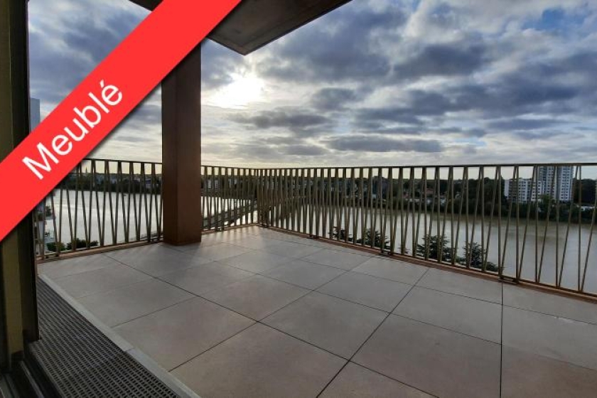 A LOUER - Appartement T2 Meublé - NANTES Vue LOIRE - Appartement T2 MEUBLE de 45.44m2 sur les bords de la Loire, à proximité du centre commercial BEAULIEU et des transports, dans une résidence de 2023 situé au 8ème étage avec ascenseur. L'appartement comprend, une entrée, une pièce de vie avec une belle cuisine aménagée et équipée (Four, hotte, plaques), un GRAND balcon de 12.44m² exposé sud-ouest donnant directement sur la Loire sans vis à vis, une salle d'eau avec WC et une chambre avec DRESSING et BUREAU. De nombreux rangements.