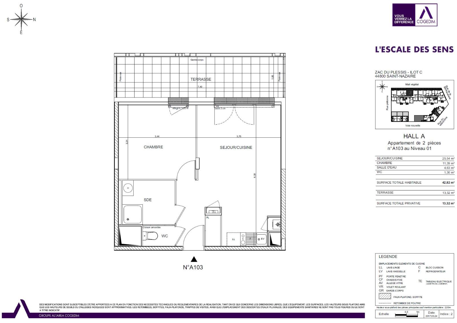 Au sein d'une résidence de 2019, au 1er étage un appartement de type 2 d'une surface de 42m² comprenant une entrée avec placards, une salle d'eau, un toilette séparé, une chambre, une pièce de vie avec coin cuisine aménagée et équipée (hotte, plaque, frigo), une terrasse.