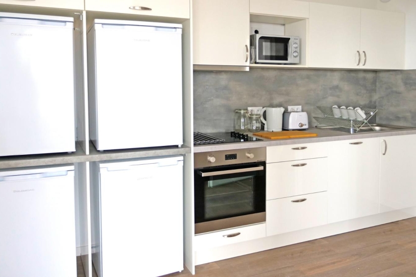 Cuisine équipée : plaques induction, four, réfrigérateur individuel, placards personnels, bouilloire, grille-pain, ustensiles,...