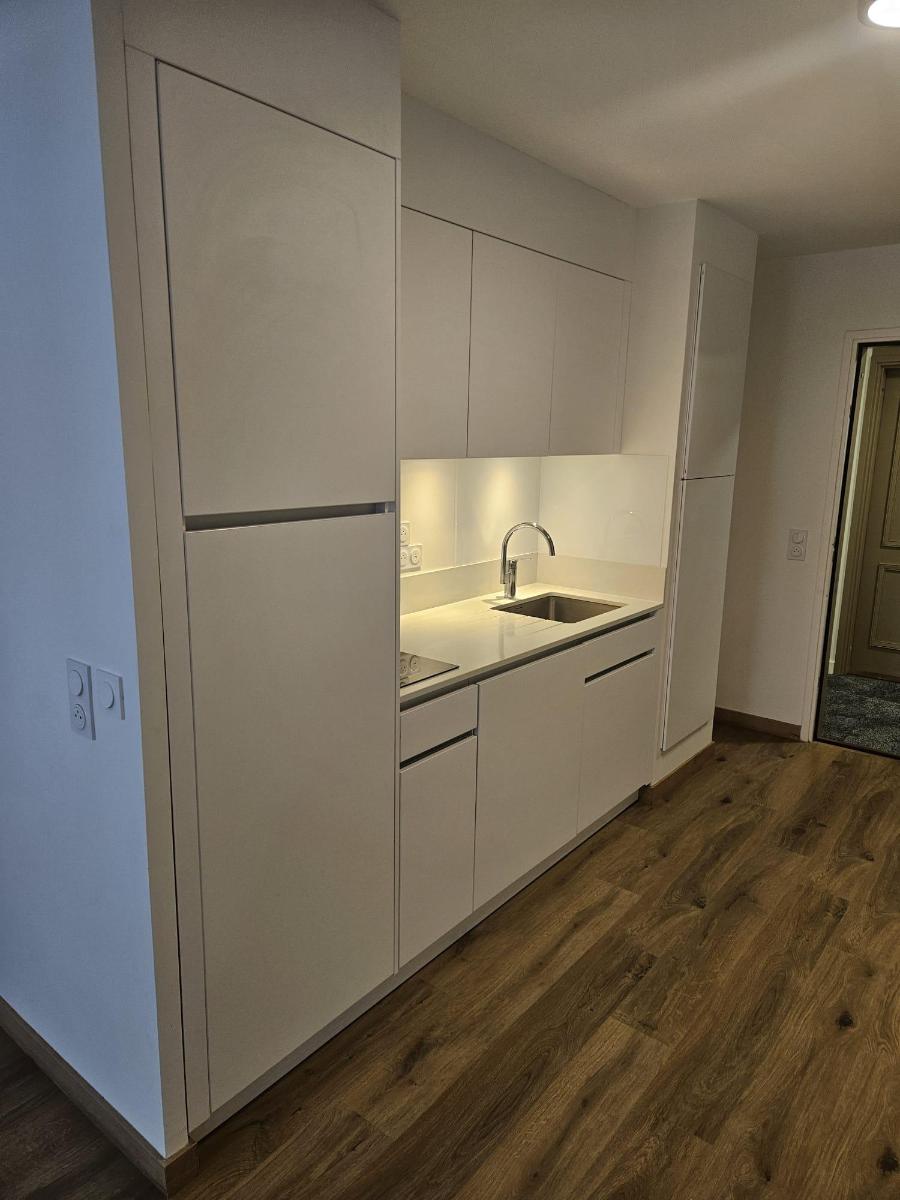 - D'une cuisine ouverte entièrement aménagée et équipée (plaque vitrocéramique / hotte / réfrigérateur / congélateur)