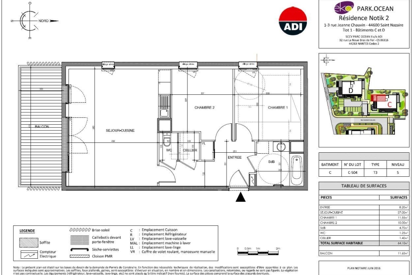 Au sein d'une résidence de 2017 sécurisée avec ascenseur, un appartement au 5ème étage de type 3 d'une surface de 64m² comprenant une entrée avec placard, une salle de bains, deux chambres, un toilette séparé, une pièce de vie avec coin cuisine aménagée et équipée (hotte, plaque et frigo). Une terrasse.