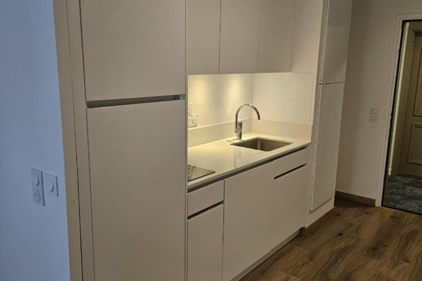 - D'une cuisine ouverte entièrement aménagée et équipée (plaque vitrocéramique / hotte / réfrigérateur / congélateur)