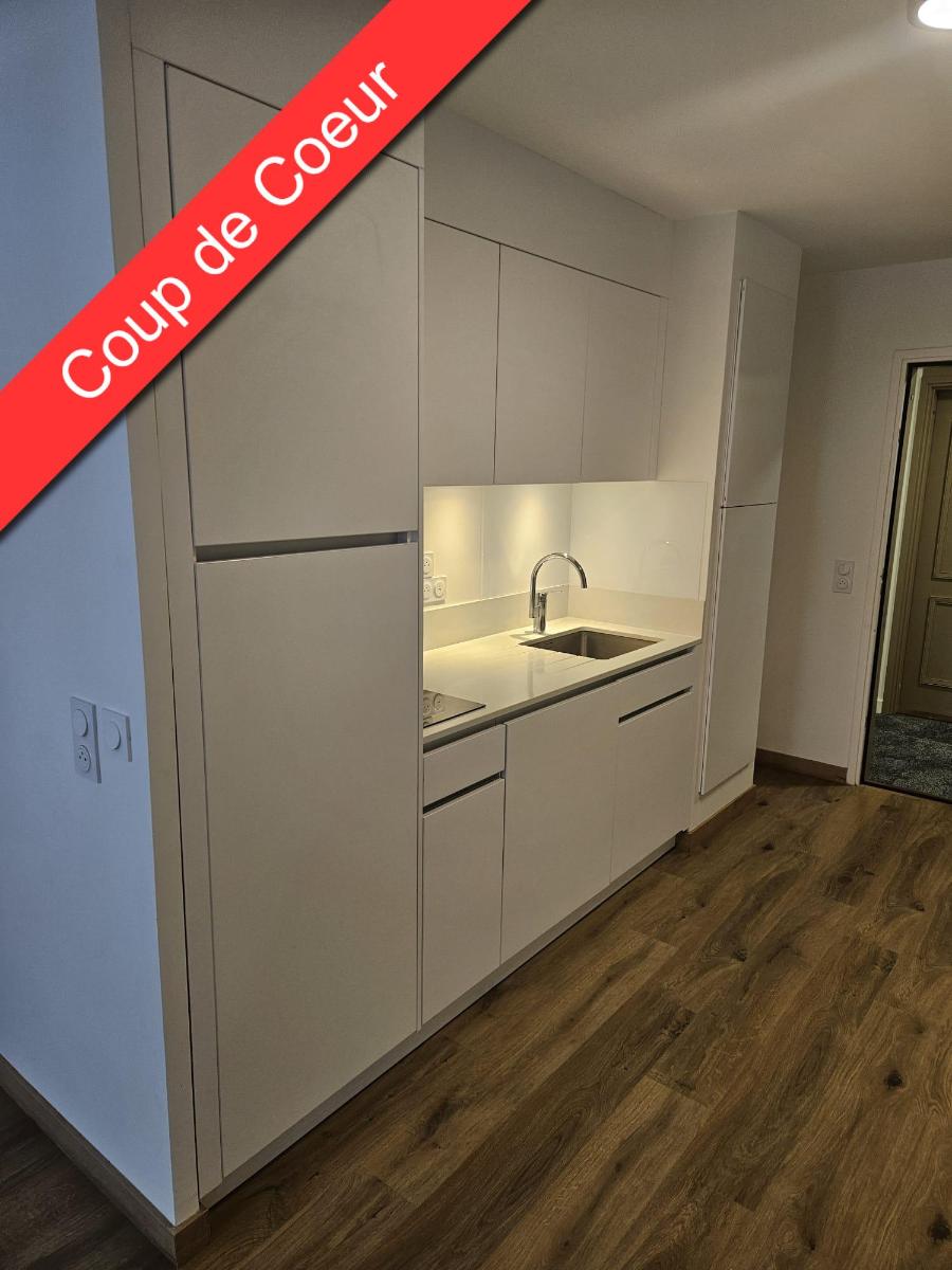 - D'une cuisine ouverte entièrement aménagée et équipée (plaque vitrocéramique / hotte / réfrigérateur / congélateur)